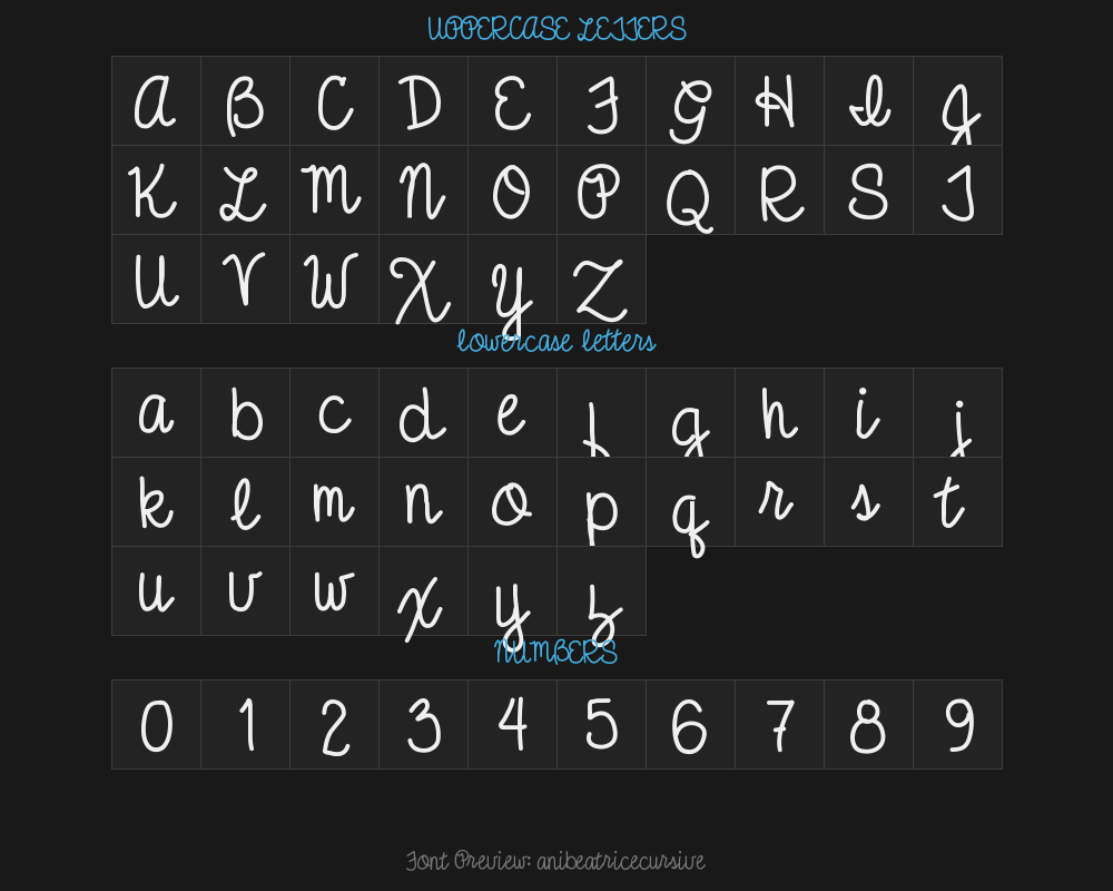 anibeatricecursive is a font file with a size of 0.03 MB. The full font name is AniBeatriceCursive, Version 001.000 version. It contains 109 characters, supports 8 Chinese characters. The copyright belongs to AniBeatriceCursive. anibeatricecursive font is available for free download, but commercial use requires confirmation on the AniBeatriceCursive official website whether it's free for commercial use.
