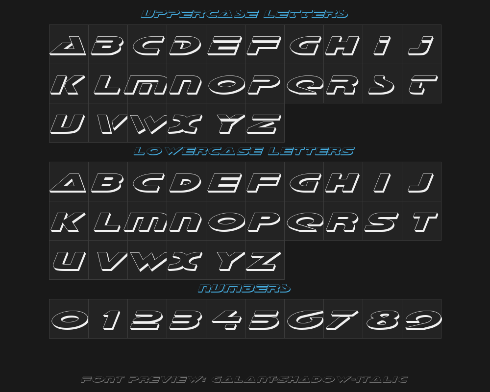 galant-shadow-italic is a font file with a size of 0.04 MB. The full font name is Galant Shadow Italic, 2 version. It contains 218 characters, supports 8 Chinese characters. The copyright belongs to Galant Shadow Italic. galant-shadow-italic font is available for free download, but commercial use requires confirmation on the Galant Shadow Italic official website whether it's free for commercial use.